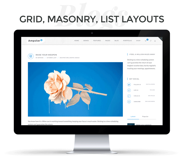 Create a blog that is as unique as you are! Our vast selection of pre-made blog layouts and shortcodes make it easier than ever to build your perfect blog, from list view to grid view, customized author pages and more! Ampster even offers a variety of complete blog website ready to import, including a grid/left menu blog, a personal style blog and a magazine style blog. Start driving traffic to your new blog website with Ampster today!